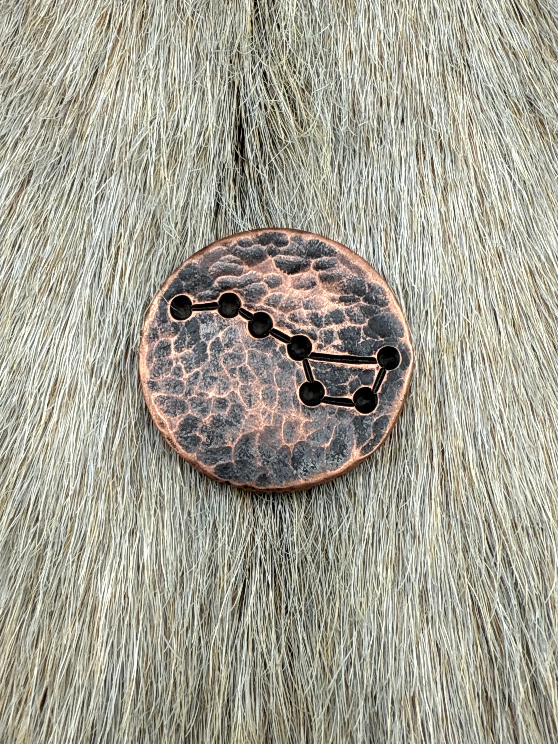 New for 2025: 1 1/4” textured copper coin with constellation design and blackened finish.