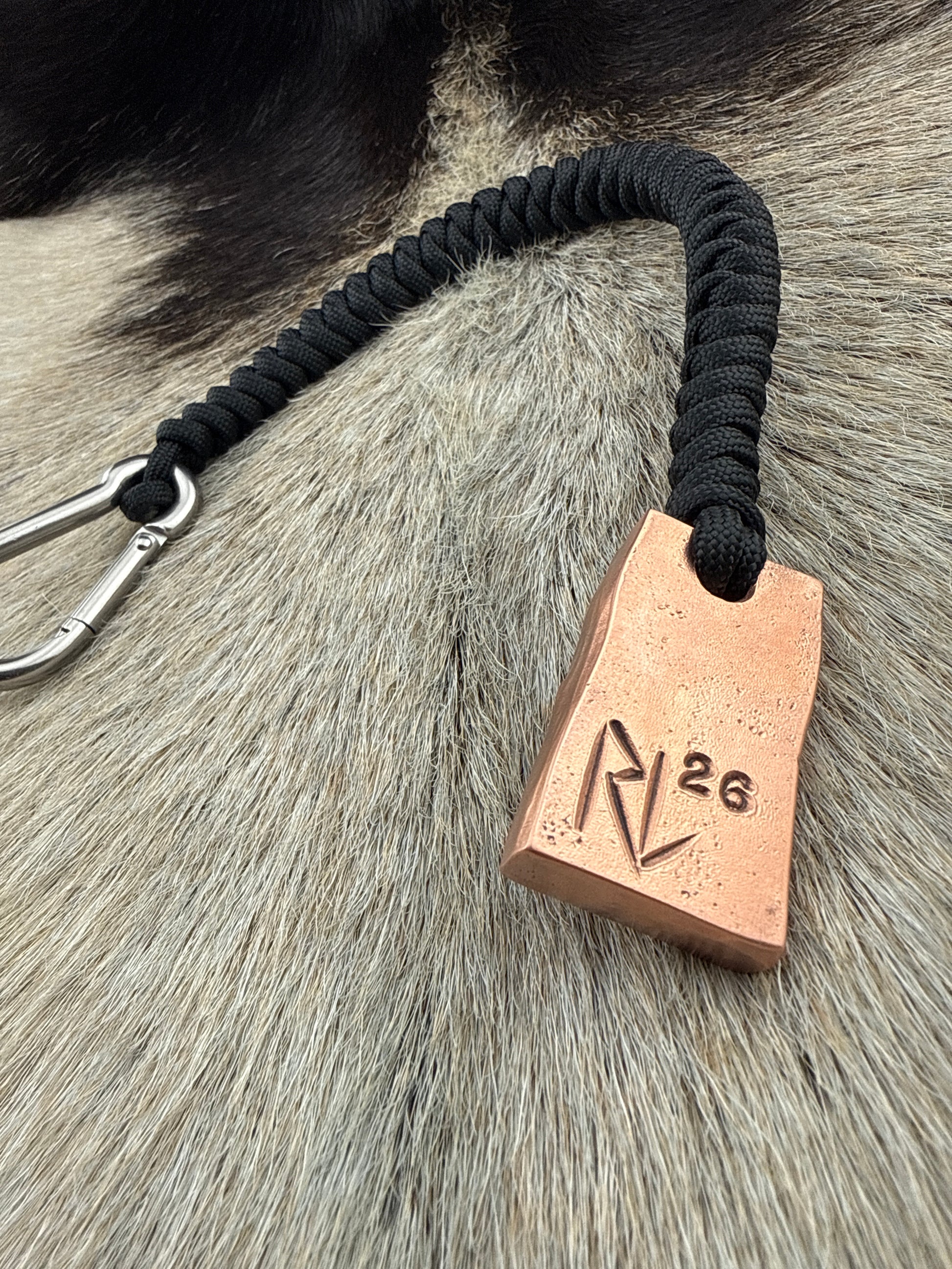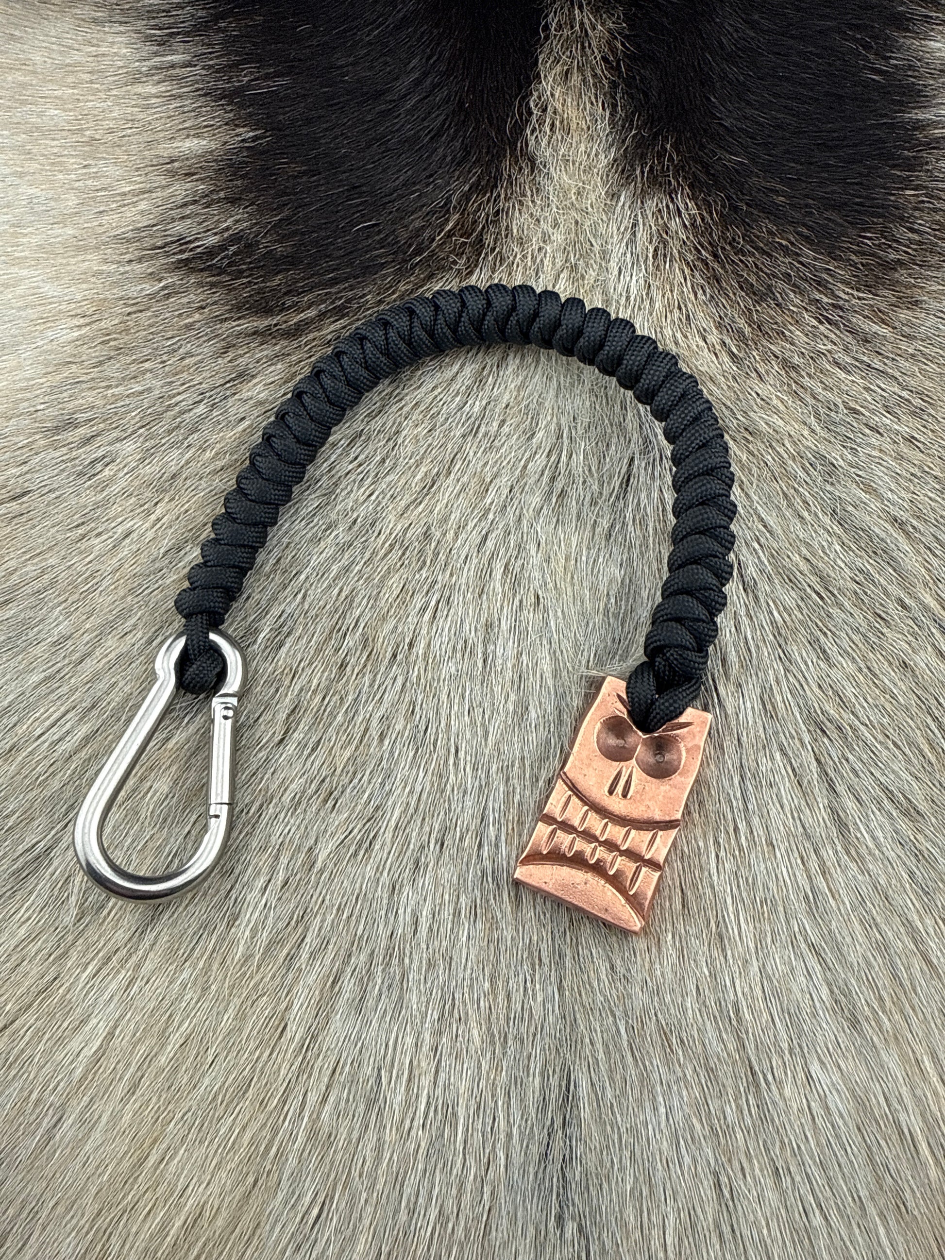 SkullCrusher hand forged from a salvaged 1/4” copper bar with 550 paracord lanyard and stainless carabiner.