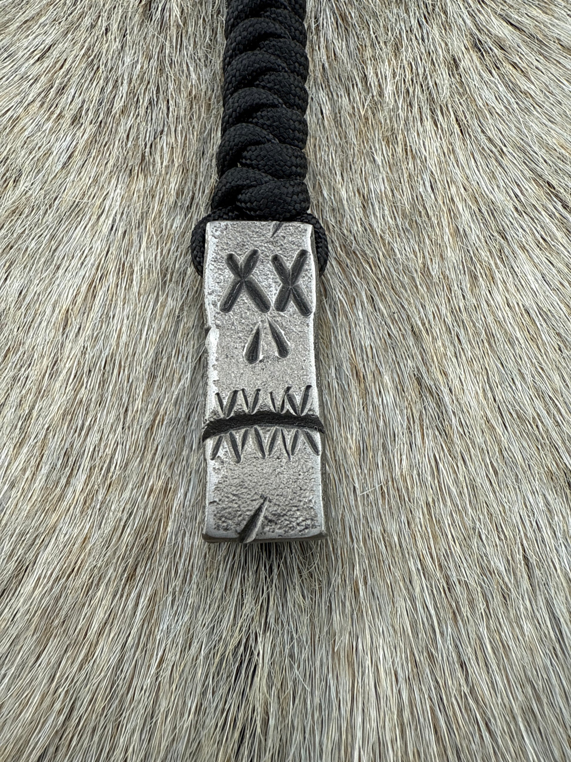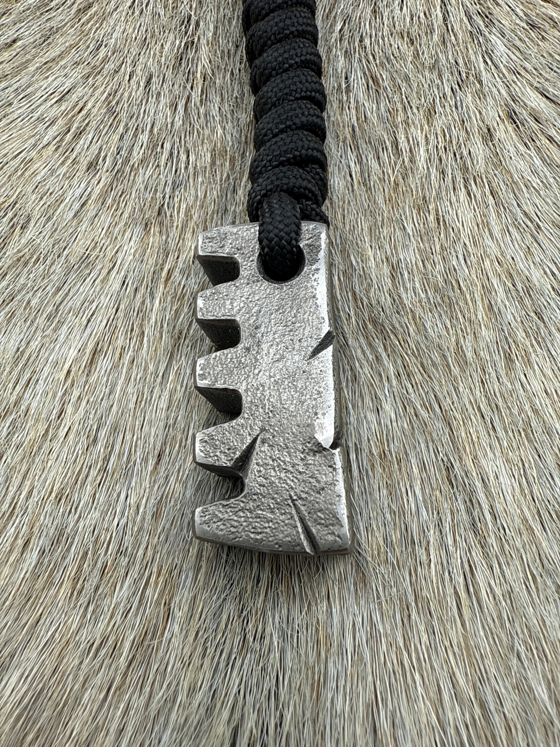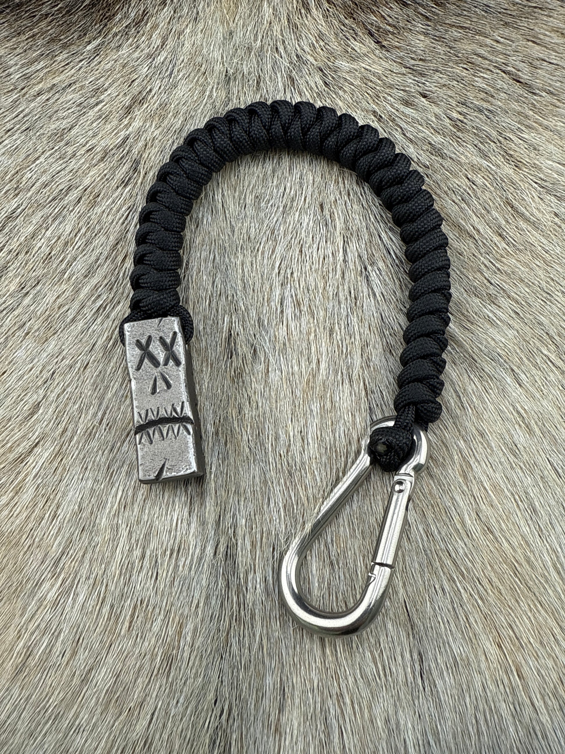 SkullCrusher forged from salvaged flywheel teeth with 550 paracord lanyard and stainless carabiner.