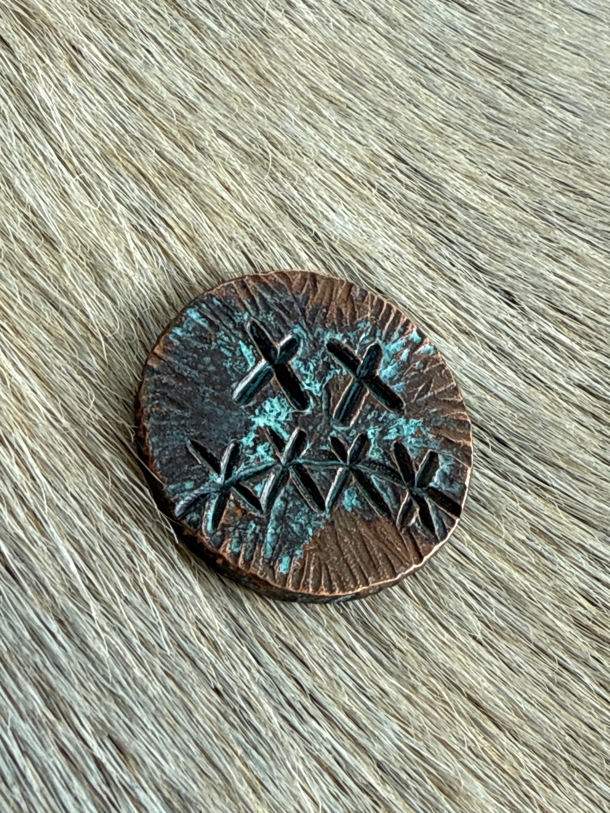 New for 2025: 1 1/4” textured copper coin with DeadSkull design and patina.