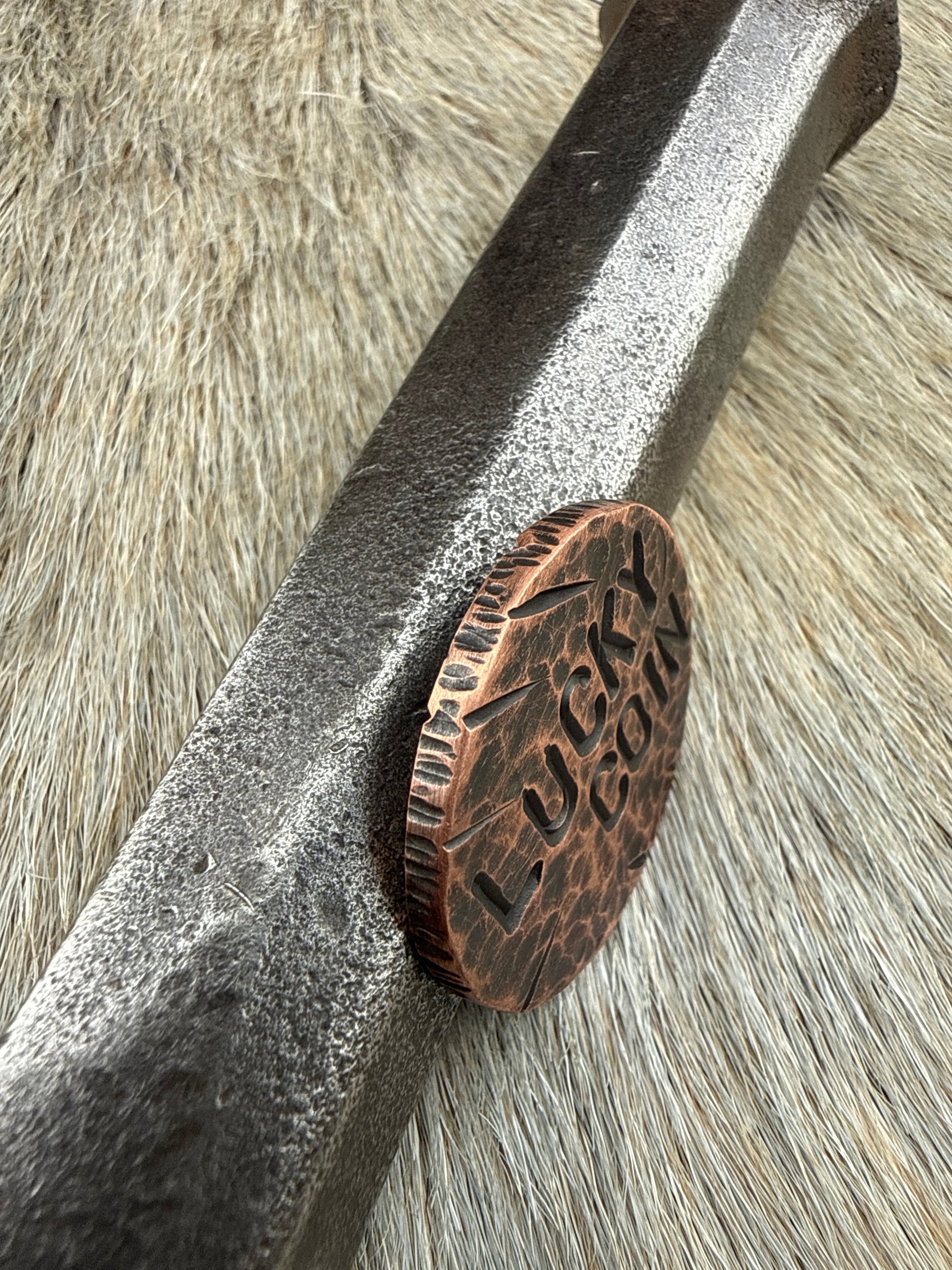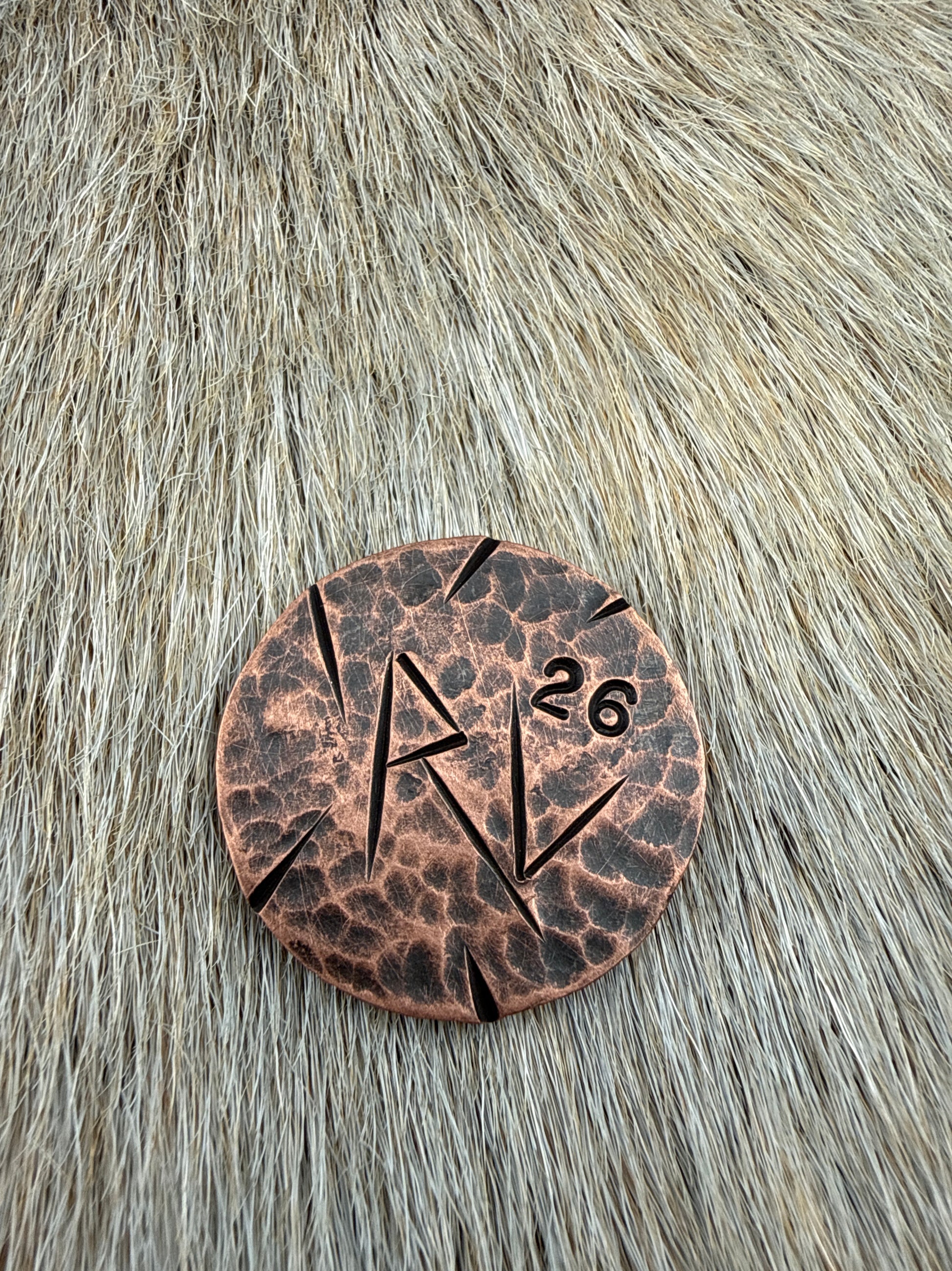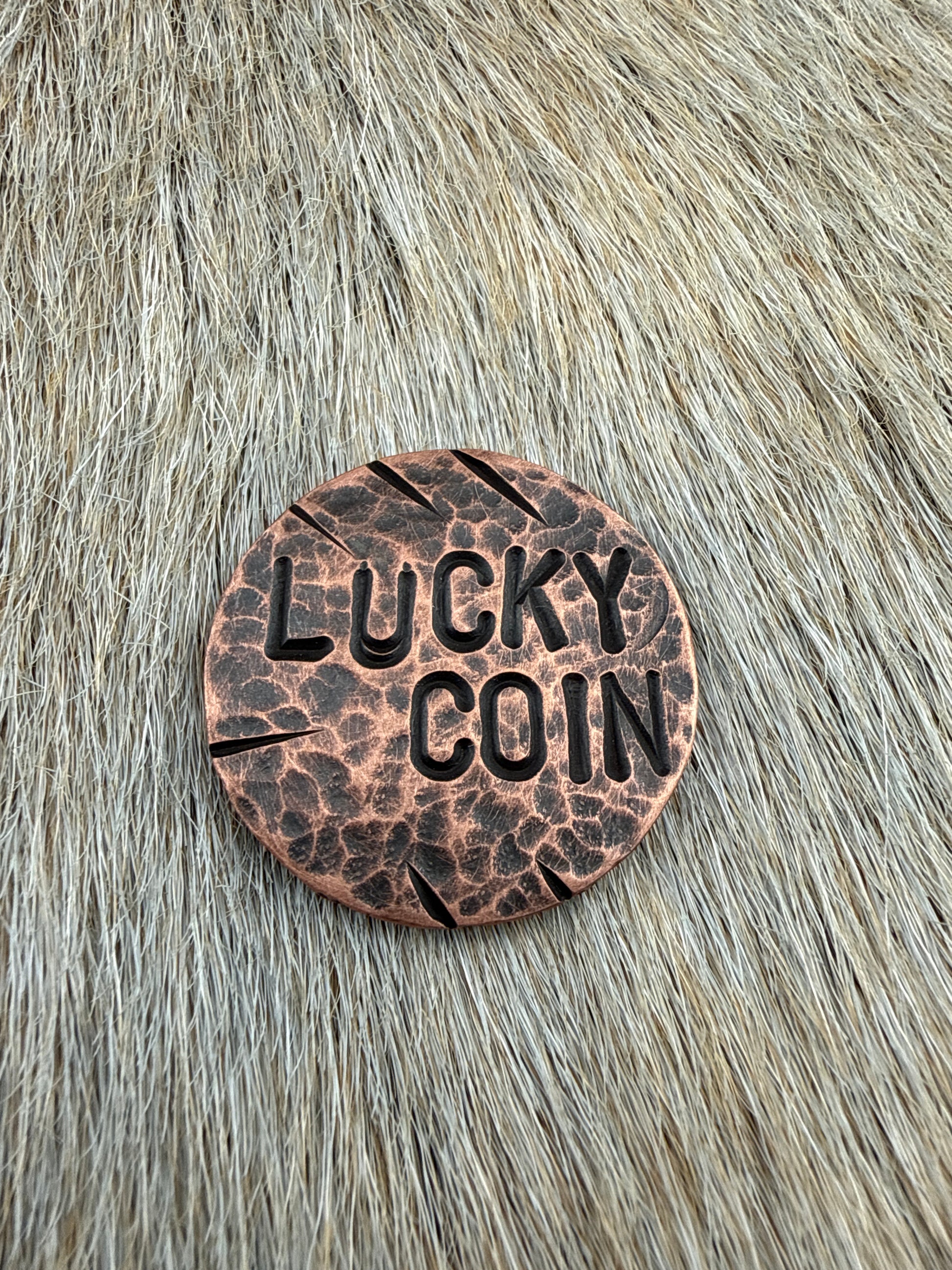 1 1/4” Copper coin with black patina and “Lucky Coin” hand stamped design.